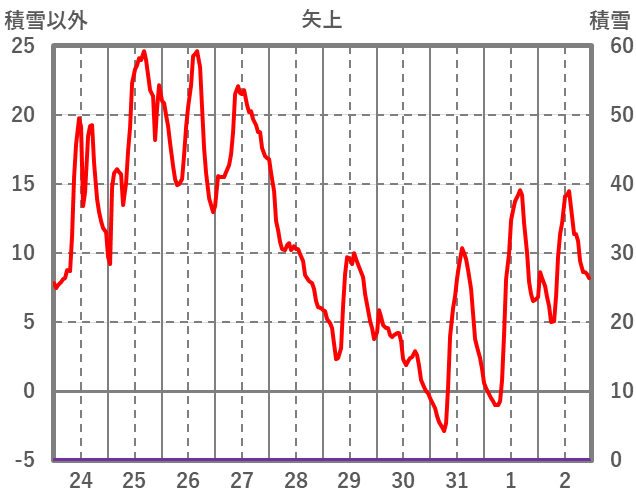 | 日 | 時 | 気温 | 降水 | 風向/風速 | 日照 | 積雪 | 降雪 |