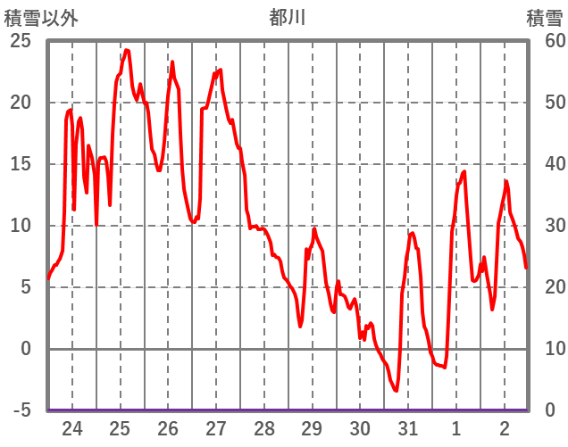 | 日 | 時 | 気温 | 降水 | 風向/風速 | 日照 | 積雪 | 降雪 |