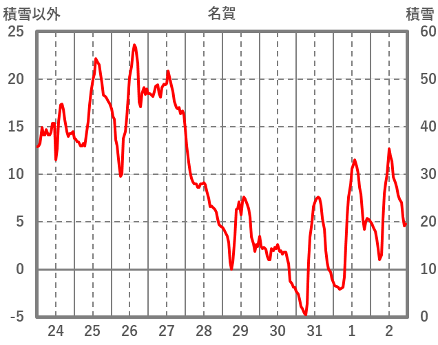| 日 | 時 | 気温 | 降水 | 風向/風速 | 日照 | 積雪 | 降雪 |