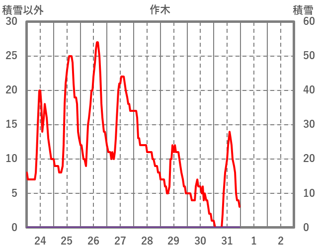 | 日 | 時 | 気温 | 降水 | 風向/風速 | 日照 | 積雪 | 降雪 |