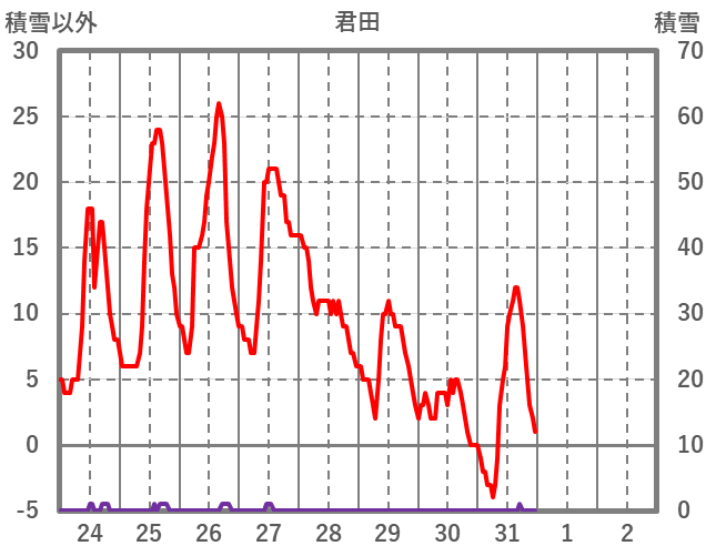 | 日 | 時 | 気温 | 降水 | 風向/風速 | 日照 | 積雪 | 降雪 |