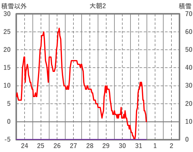 | 日 | 時 | 気温 | 降水 | 風向/風速 | 日照 | 積雪 | 降雪 |