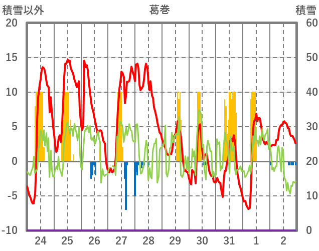 | 日 | 時 | 気温 | 降水 | 風向/風速 | 日照 | 積雪 | 降雪 |