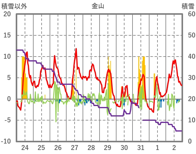 | 日 | 時 | 気温 | 降水 | 風向/風速 | 日照 | 積雪 | 降雪 |