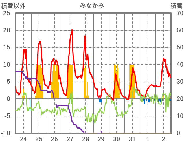 | 日 | 時 | 気温 | 降水 | 風向/風速 | 日照 | 積雪 | 降雪 |
