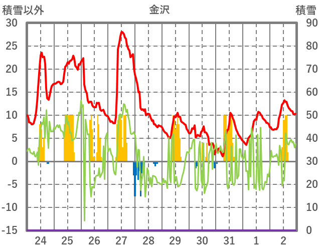 | 日 | 時 | 気温 | 降水 | 風向/風速 | 日照 | 積雪 | 降雪 |