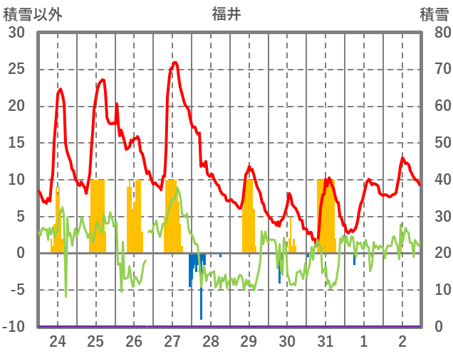 | 日 | 時 | 気温 | 降水 | 風向/風速 | 日照 | 積雪 | 降雪 |