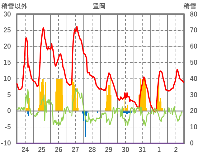| 日 | 時 | 気温 | 降水 | 風向/風速 | 日照 | 積雪 | 降雪 |