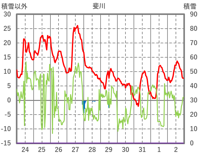 | 日 | 時 | 気温 | 降水 | 風向/風速 | 日照 | 積雪 | 降雪 |