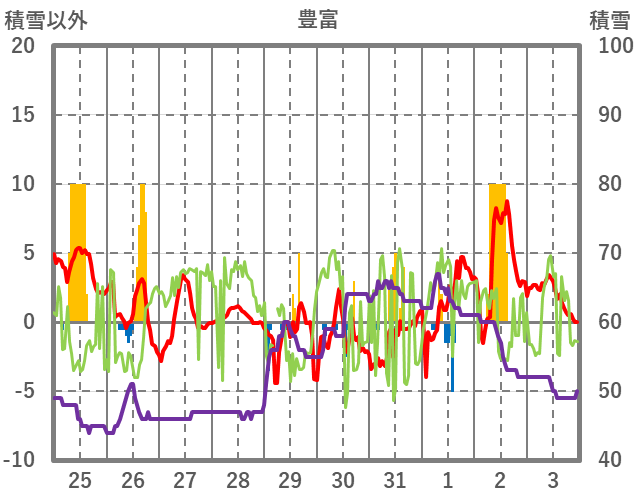 | 日 | 時 | 気温 | 降水 | 風向/風速 | 日照 | 積雪 | 降雪 |