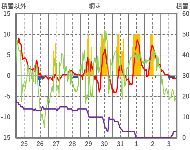 | 日 | 時 | 気温 | 降水 | 風向/風速 | 日照 | 積雪 | 降雪 |