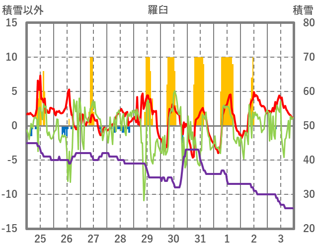 | 日 | 時 | 気温 | 降水 | 風向/風速 | 日照 | 積雪 | 降雪 |