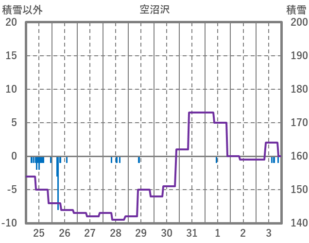 | 日 | 時 | 気温 | 降水 | 風向/風速 | 日照 | 積雪 | 降雪 |