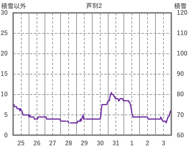 | 日 | 時 | 気温 | 降水 | 風向/風速 | 日照 | 積雪 | 降雪 |