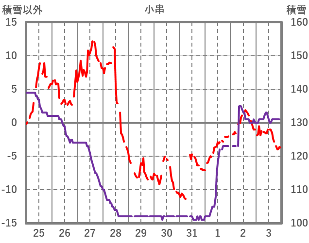 | 日 | 時 | 気温 | 降水 | 風向/風速 | 日照 | 積雪 | 降雪 |