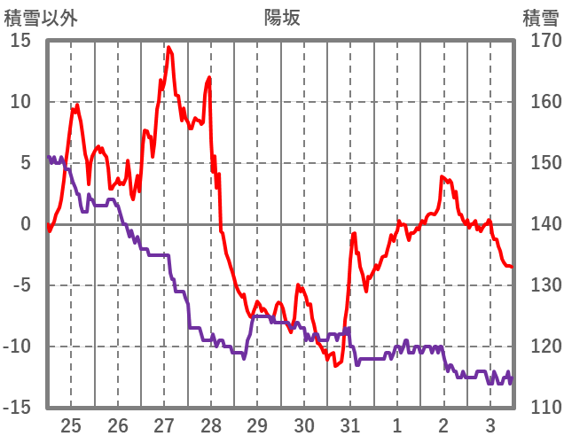| 日 | 時 | 気温 | 降水 | 風向/風速 | 日照 | 積雪 | 降雪 |