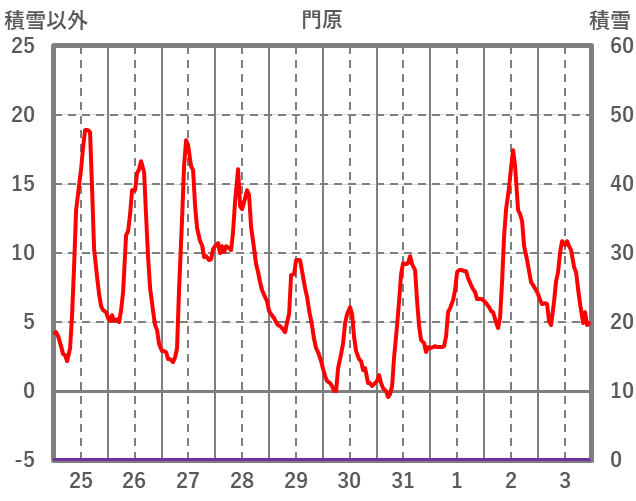 | 日 | 時 | 気温 | 降水 | 風向/風速 | 日照 | 積雪 | 降雪 |