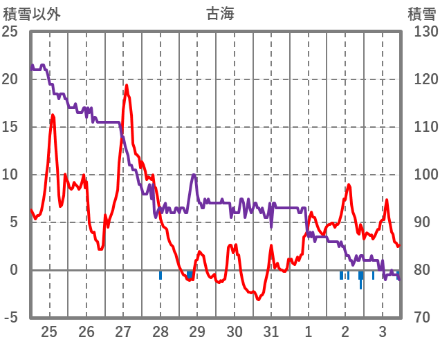 | 日 | 時 | 気温 | 降水 | 風向/風速 | 日照 | 積雪 | 降雪 |