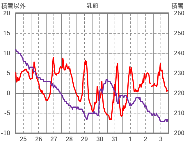 | 日 | 時 | 気温 | 降水 | 風向/風速 | 日照 | 積雪 | 降雪 |