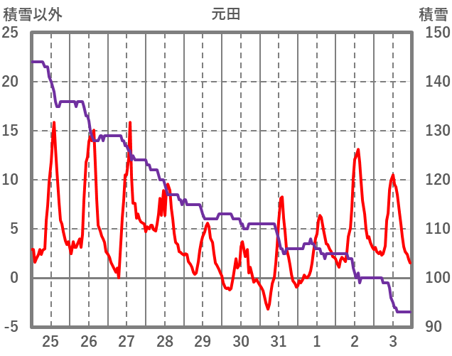 | 日 | 時 | 気温 | 降水 | 風向/風速 | 日照 | 積雪 | 降雪 |