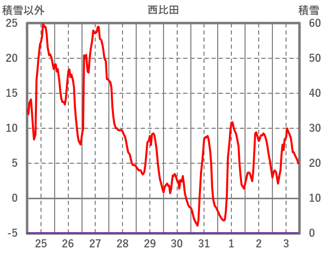 | 日 | 時 | 気温 | 降水 | 風向/風速 | 日照 | 積雪 | 降雪 |