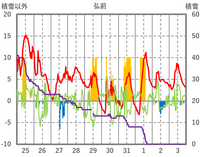 | 日 | 時 | 気温 | 降水 | 風向/風速 | 日照 | 積雪 | 降雪 |