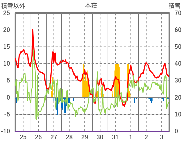 | 日 | 時 | 気温 | 降水 | 風向/風速 | 日照 | 積雪 | 降雪 |