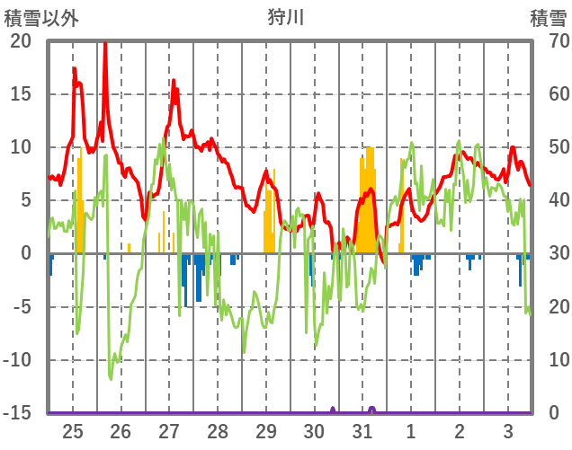 | 日 | 時 | 気温 | 降水 | 風向/風速 | 日照 | 積雪 | 降雪 |