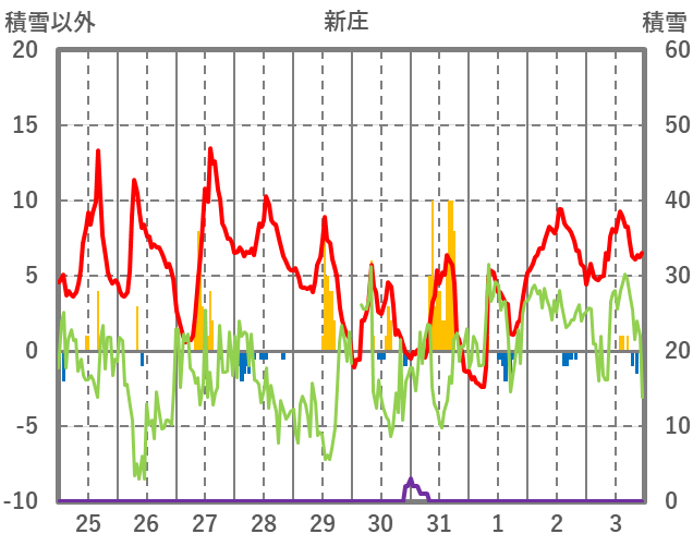 | 日 | 時 | 気温 | 降水 | 風向/風速 | 日照 | 積雪 | 降雪 |