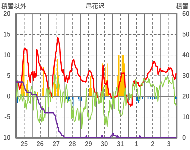 | 日 | 時 | 気温 | 降水 | 風向/風速 | 日照 | 積雪 | 降雪 |