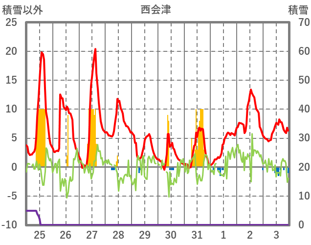 | 日 | 時 | 気温 | 降水 | 風向/風速 | 日照 | 積雪 | 降雪 |