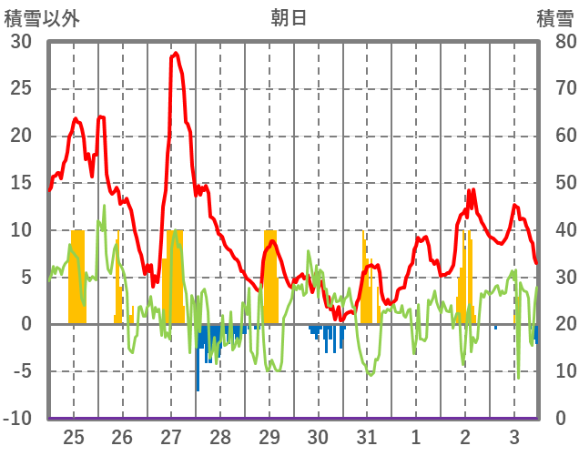 | 日 | 時 | 気温 | 降水 | 風向/風速 | 日照 | 積雪 | 降雪 |