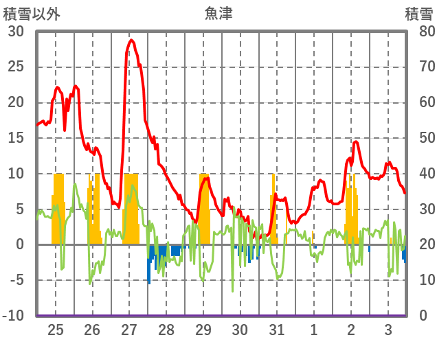 | 日 | 時 | 気温 | 降水 | 風向/風速 | 日照 | 積雪 | 降雪 |