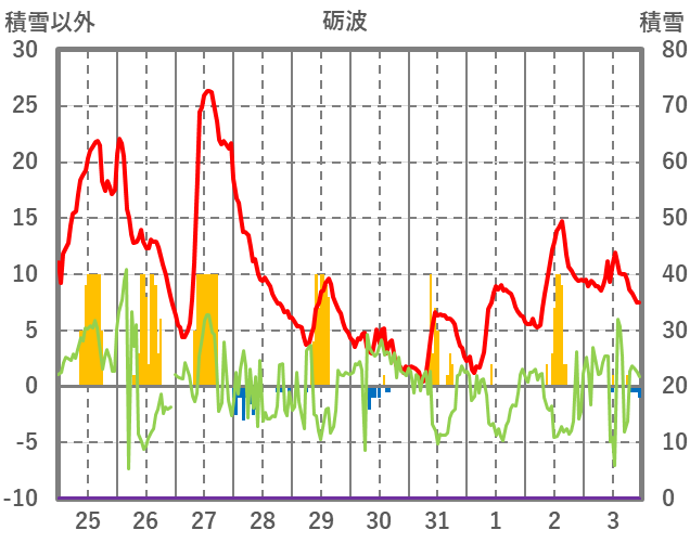 | 日 | 時 | 気温 | 降水 | 風向/風速 | 日照 | 積雪 | 降雪 |