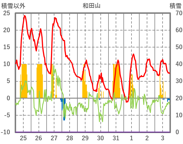 | 日 | 時 | 気温 | 降水 | 風向/風速 | 日照 | 積雪 | 降雪 |