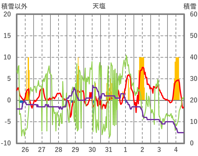 | 日 | 時 | 気温 | 降水 | 風向/風速 | 日照 | 積雪 | 降雪 |