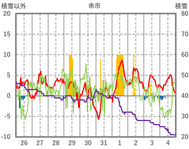 | 日 | 時 | 気温 | 降水 | 風向/風速 | 日照 | 積雪 | 降雪 |
