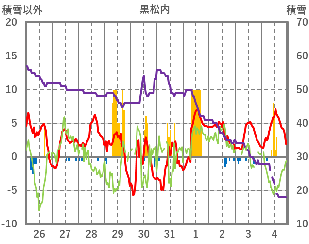 | 日 | 時 | 気温 | 降水 | 風向/風速 | 日照 | 積雪 | 降雪 |