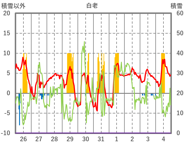 | 日 | 時 | 気温 | 降水 | 風向/風速 | 日照 | 積雪 | 降雪 |