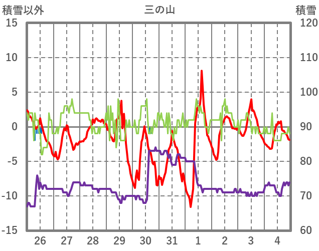 | 日 | 時 | 気温 | 降水 | 風向/風速 | 日照 | 積雪 | 降雪 |