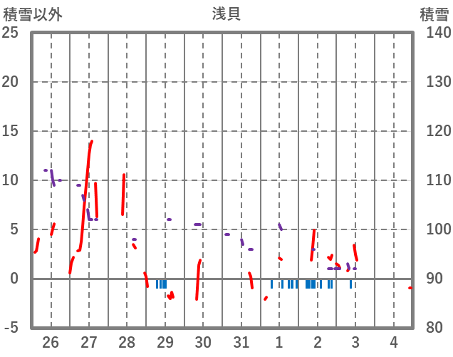 | 日 | 時 | 気温 | 降水 | 風向/風速 | 日照 | 積雪 | 降雪 |