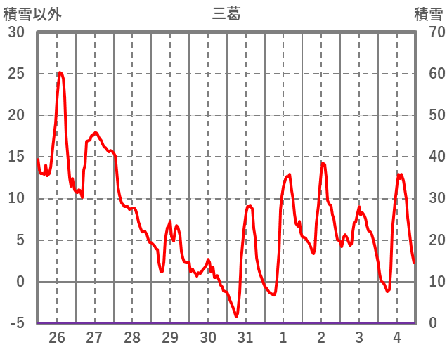 | 日 | 時 | 気温 | 降水 | 風向/風速 | 日照 | 積雪 | 降雪 |