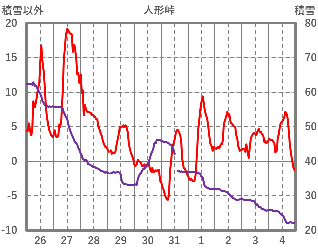 | 日 | 時 | 気温 | 降水 | 風向/風速 | 日照 | 積雪 | 降雪 |