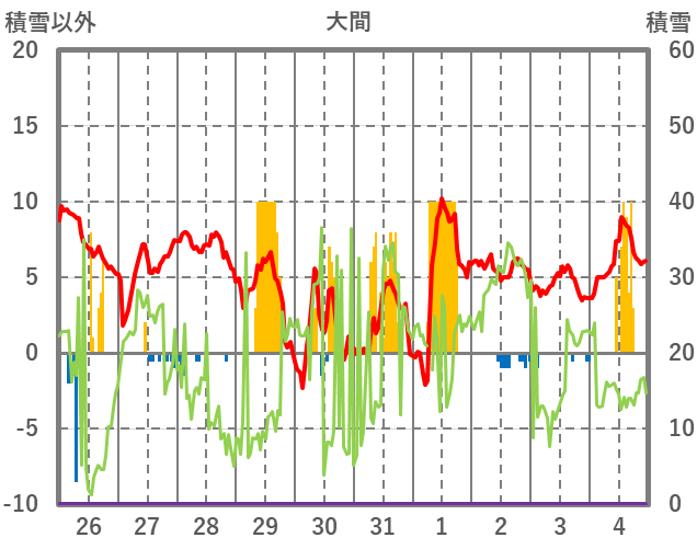 | 日 | 時 | 気温 | 降水 | 風向/風速 | 日照 | 積雪 | 降雪 |
