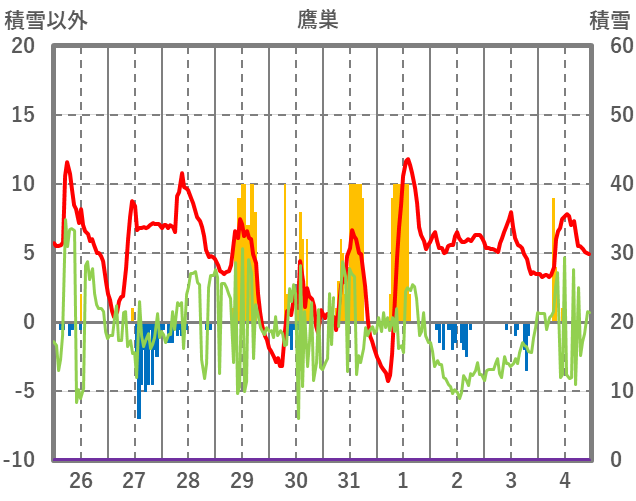 | 日 | 時 | 気温 | 降水 | 風向/風速 | 日照 | 積雪 | 降雪 |