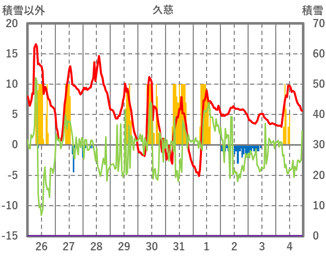 | 日 | 時 | 気温 | 降水 | 風向/風速 | 日照 | 積雪 | 降雪 |