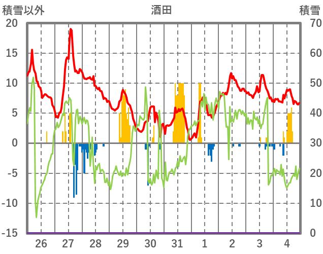 | 日 | 時 | 気温 | 降水 | 風向/風速 | 日照 | 積雪 | 降雪 |