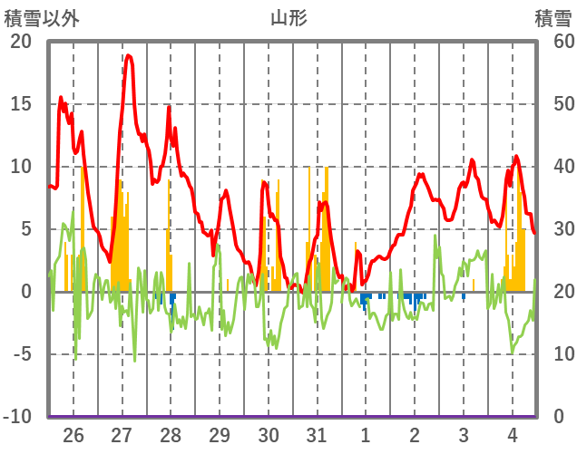 | 日 | 時 | 気温 | 降水 | 風向/風速 | 日照 | 積雪 | 降雪 |