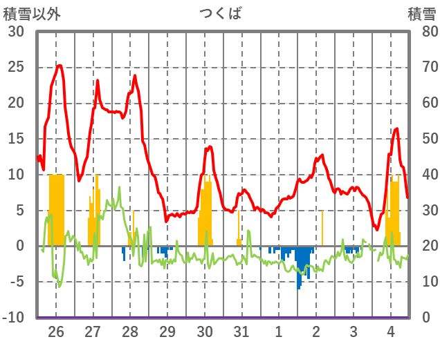 | 日 | 時 | 気温 | 降水 | 風向/風速 | 日照 | 積雪 | 降雪 |