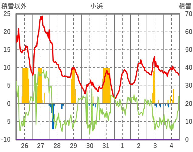 | 日 | 時 | 気温 | 降水 | 風向/風速 | 日照 | 積雪 | 降雪 |